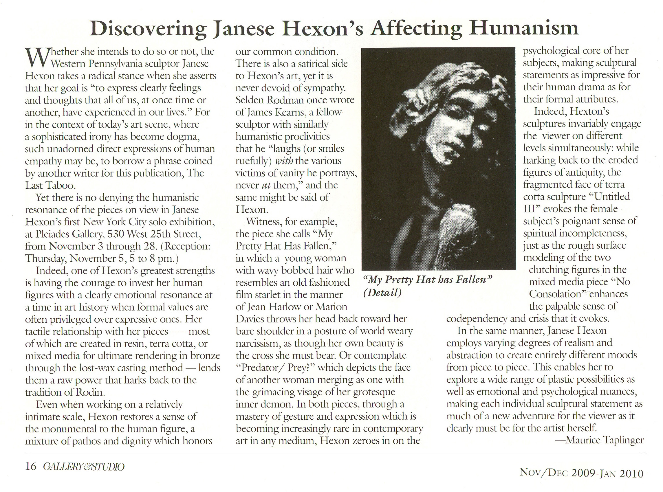 As stated by a New York critic about her sculpture†, "Such unadorned expressions of human empathy are unique" and she creates "a mixture of pathos and dignity which honors our common condition." My intention is to "express the psychological core of our human drama…restoring a sense of the monumental to the human figure." This connection to the viewer is my objective, and I consider my art a success when it evokes an emotional response.